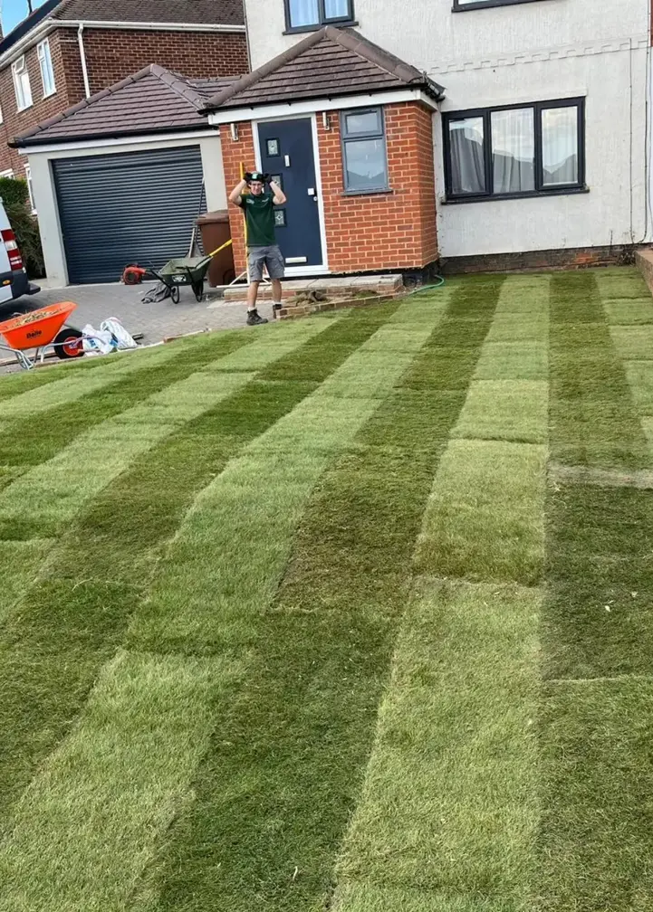 Maintenance is minimal. Water the new turf daily during the first couple of weeks, then reduce frequency as it establishes. Once the grass reaches about 5 cm, begin mowing regularly, and feed and aerate the lawn seasonally to keep it healthy and lush.