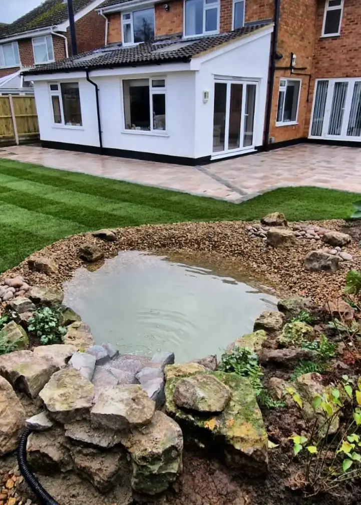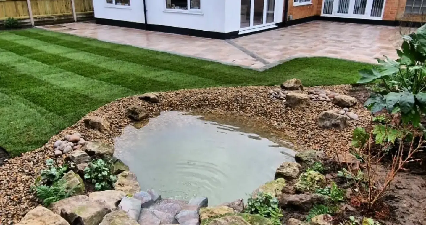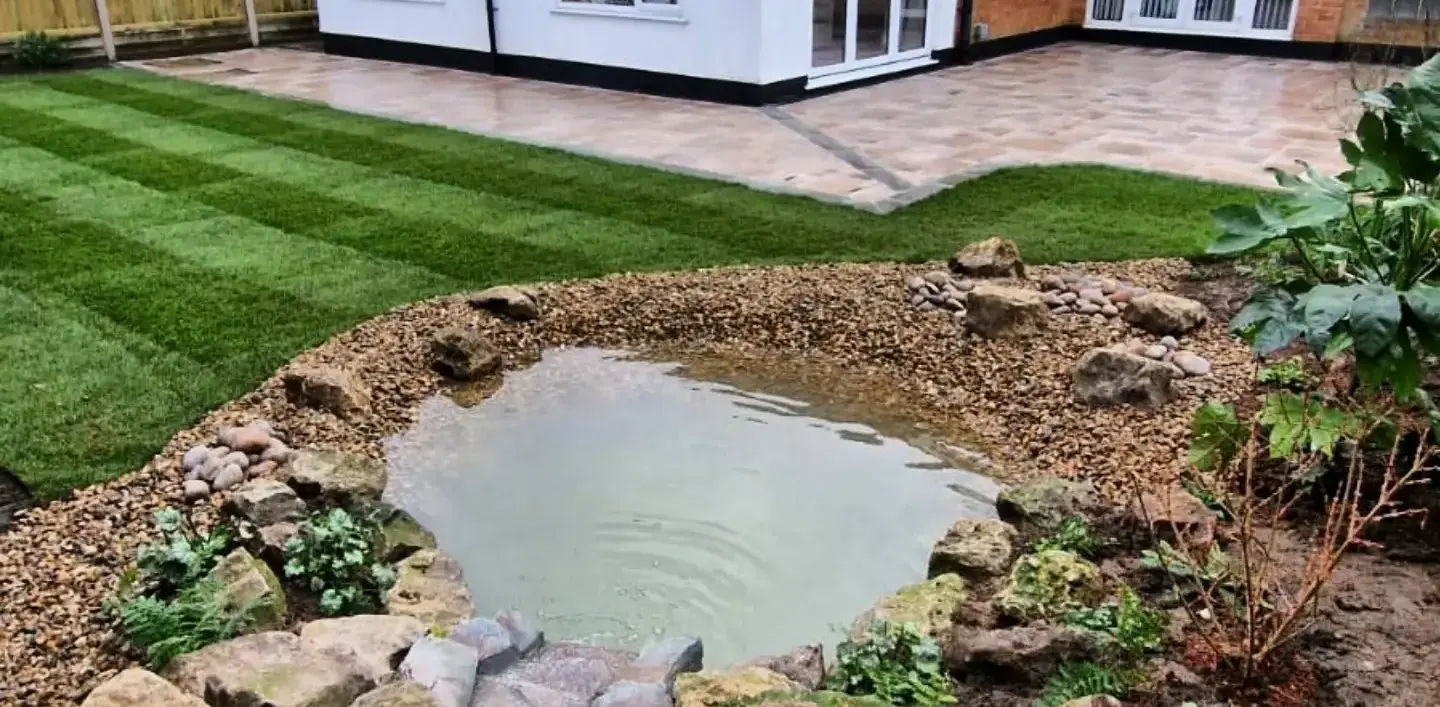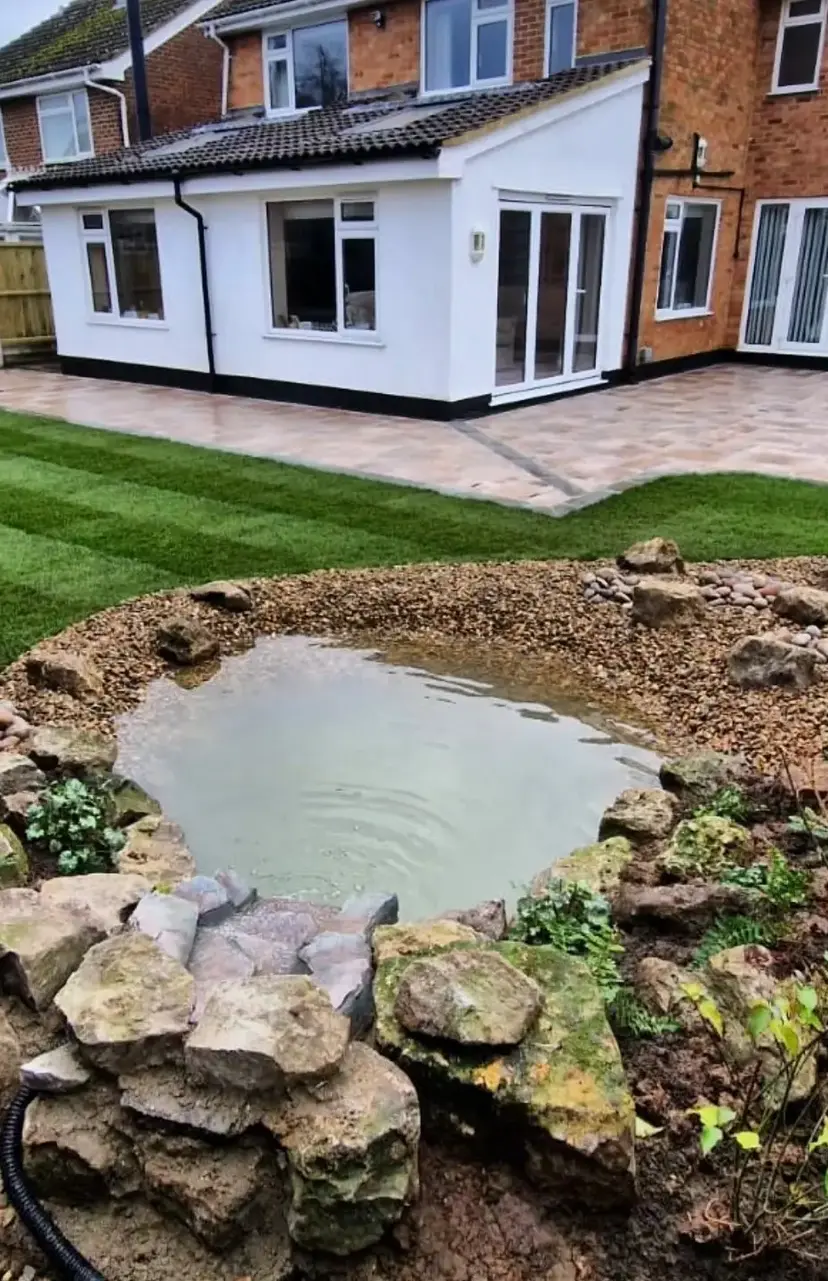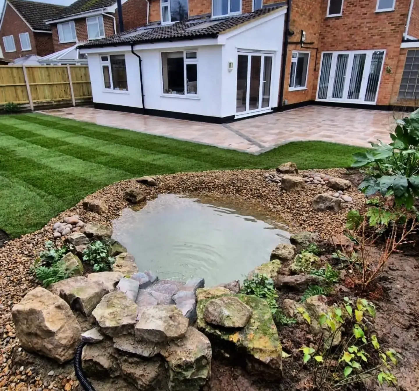 A full garden renovation like this typically takes around two to three weeks, including clearing the existing garden, installing drainage, constructing the patio and ponds, planting, and laying new turf.