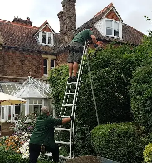 Working on hedges of this size requires skill, teamwork, and the right equipment.