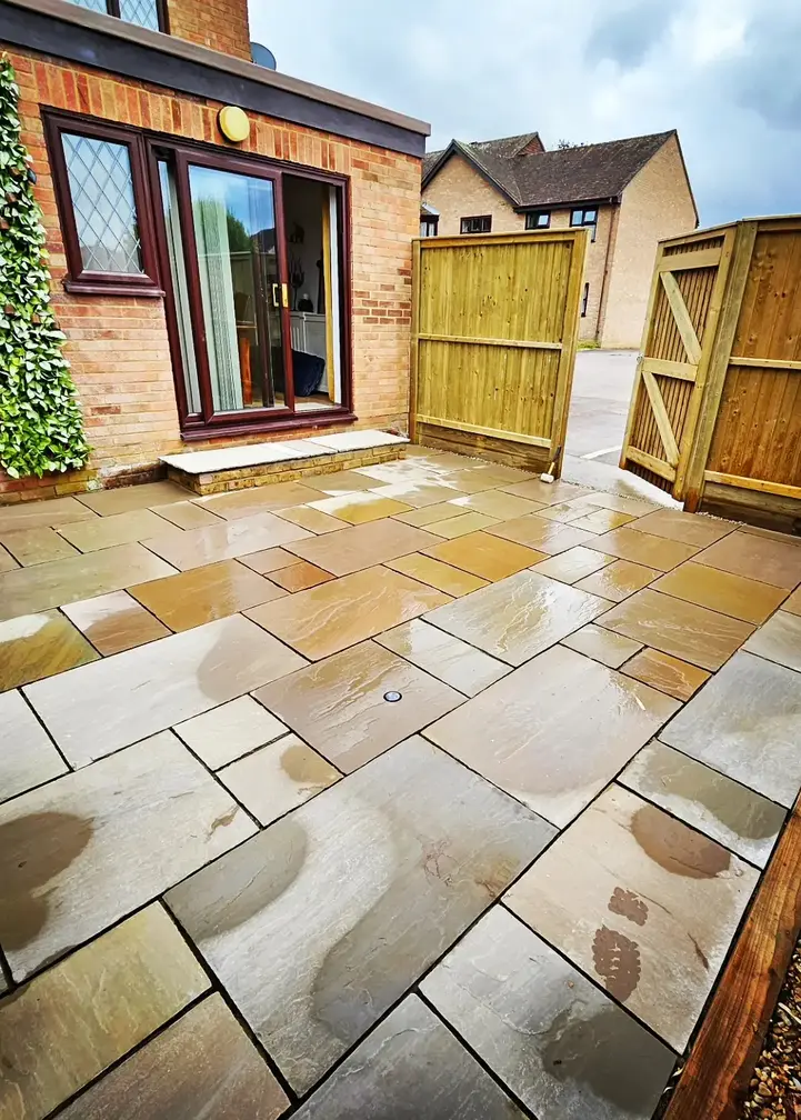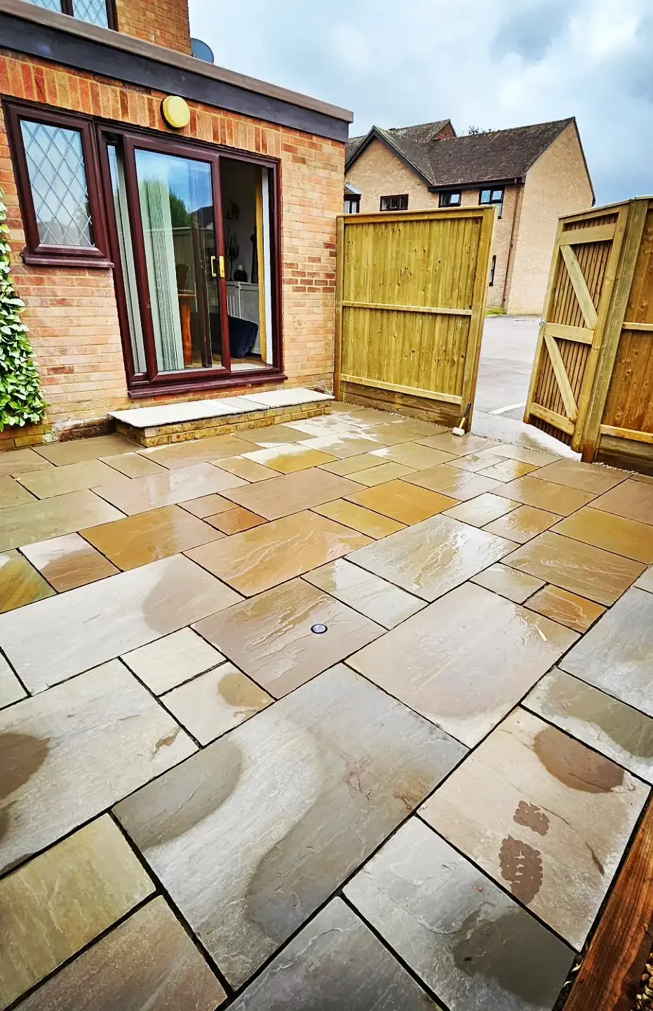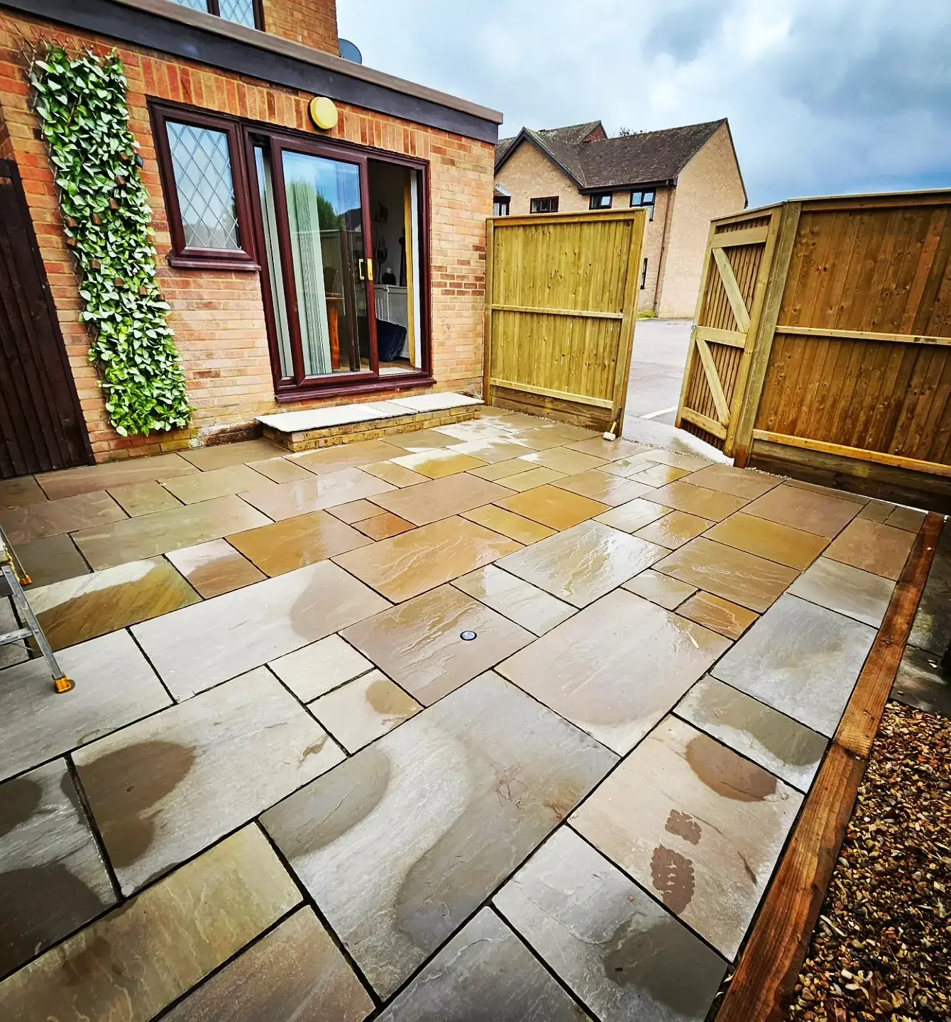 For the new patio, we chose a Raj Green Indian Sandstone, a natural stone that perfectly complements the warm tones of the property’s brickwork. Each slab was laid by hand with precision, creating a smooth, level surface ideal for outdoor dining and entertaining.