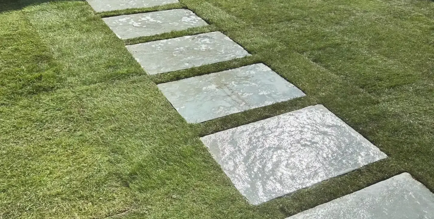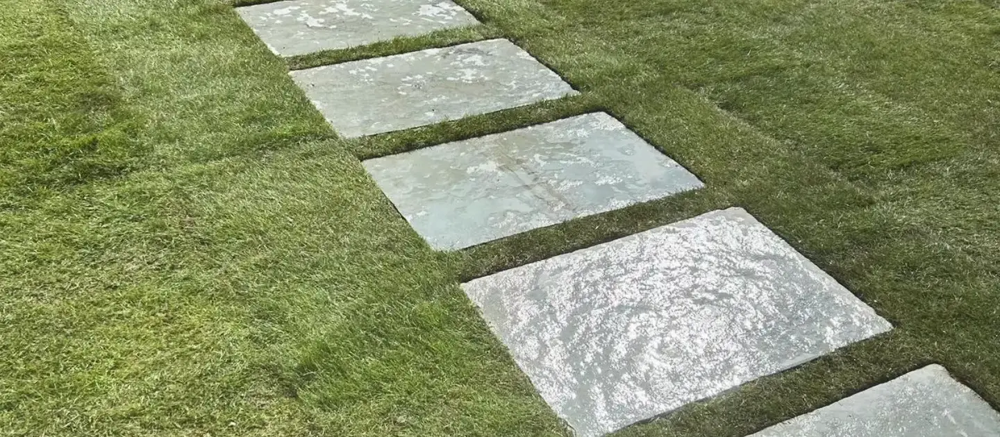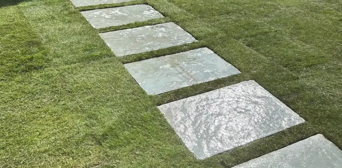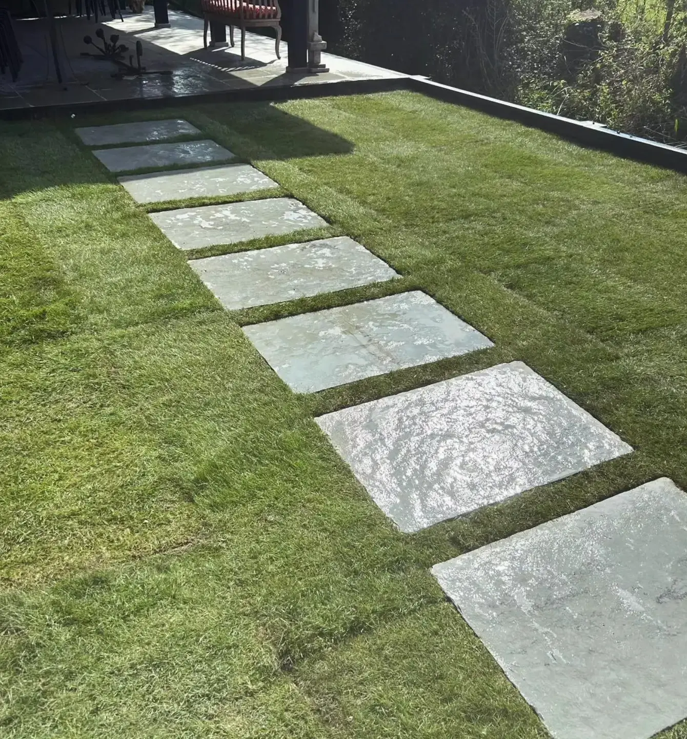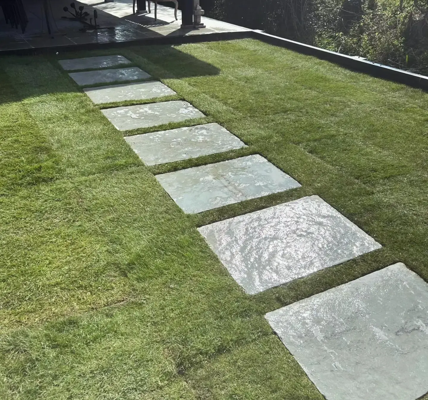 Yes. Indian sandstone is a hard‑wearing natural stone that withstands UK weather well, and premium turf creates a resilient lawn when correctly laid and cared for. A properly prepared sub-base and good drainage help both elements last for many years.