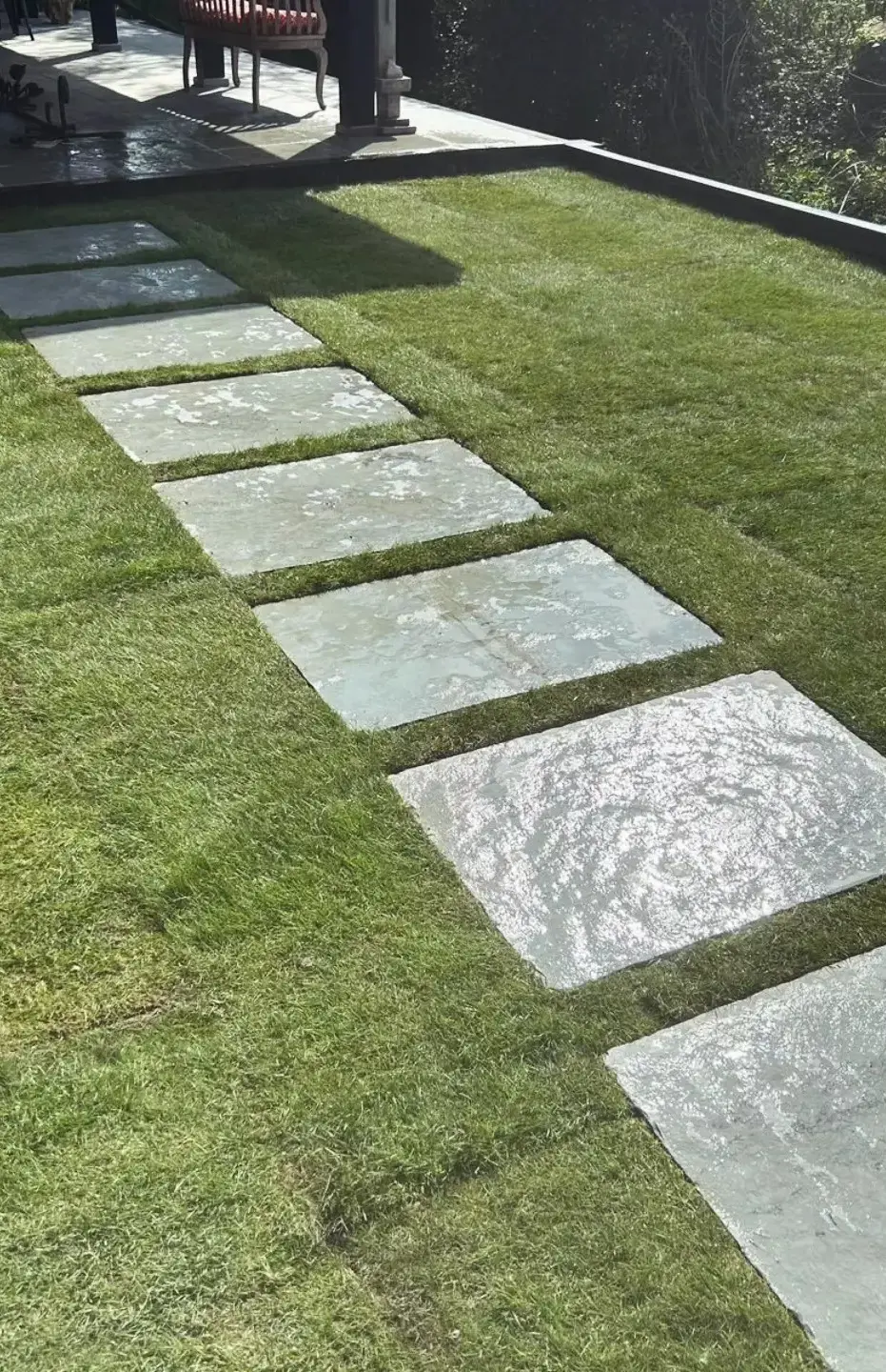 First, we removed existing materials and installed a stable sub-base. We levelled and compacted the ground to ensure proper drainage. Then we laid the sandstone paving on a full mortar bed, followed by premium turf laid in neat stripes. Finally, borders were planted with shrubs for year‑round interest.