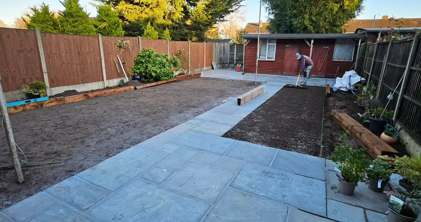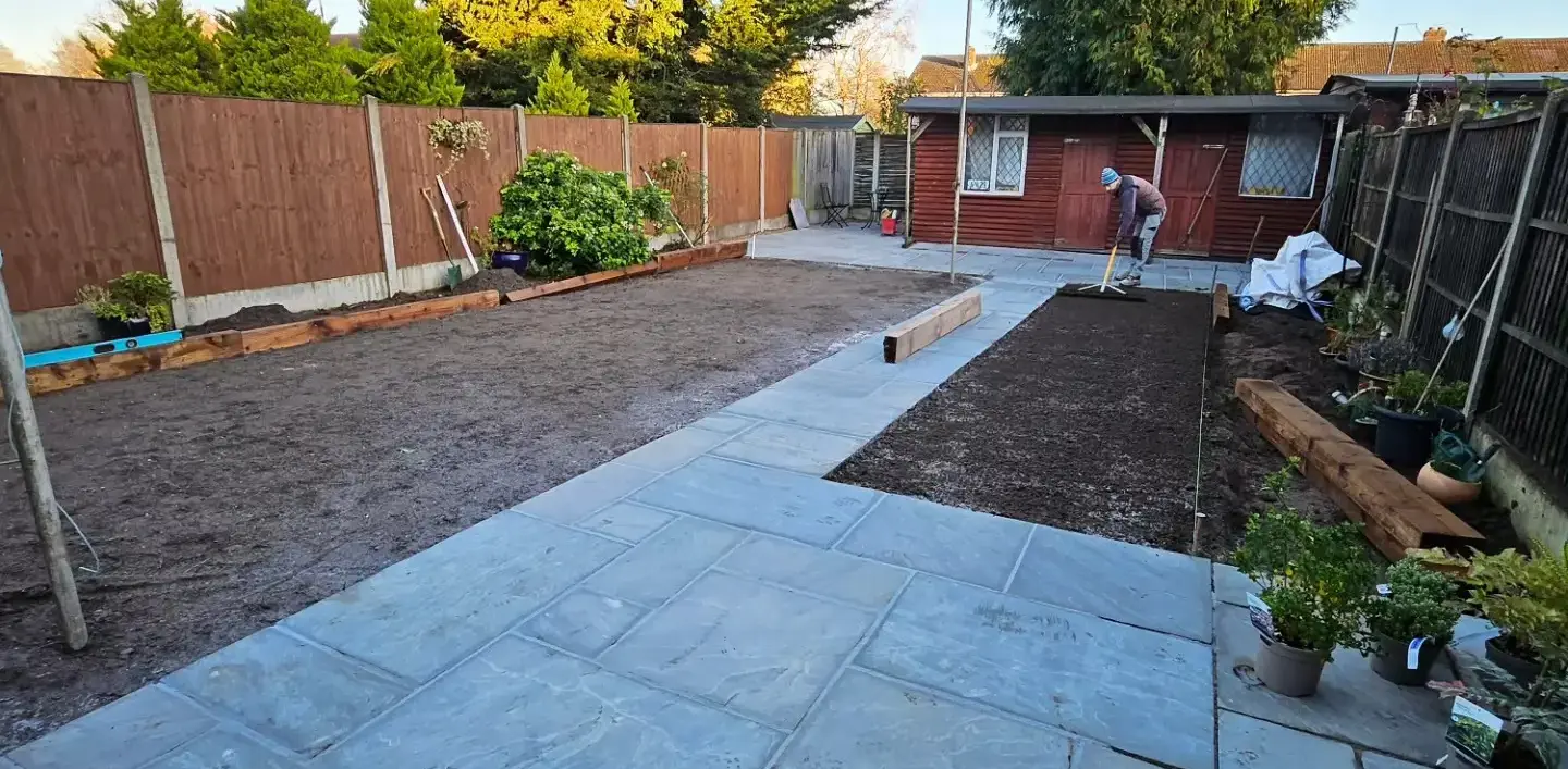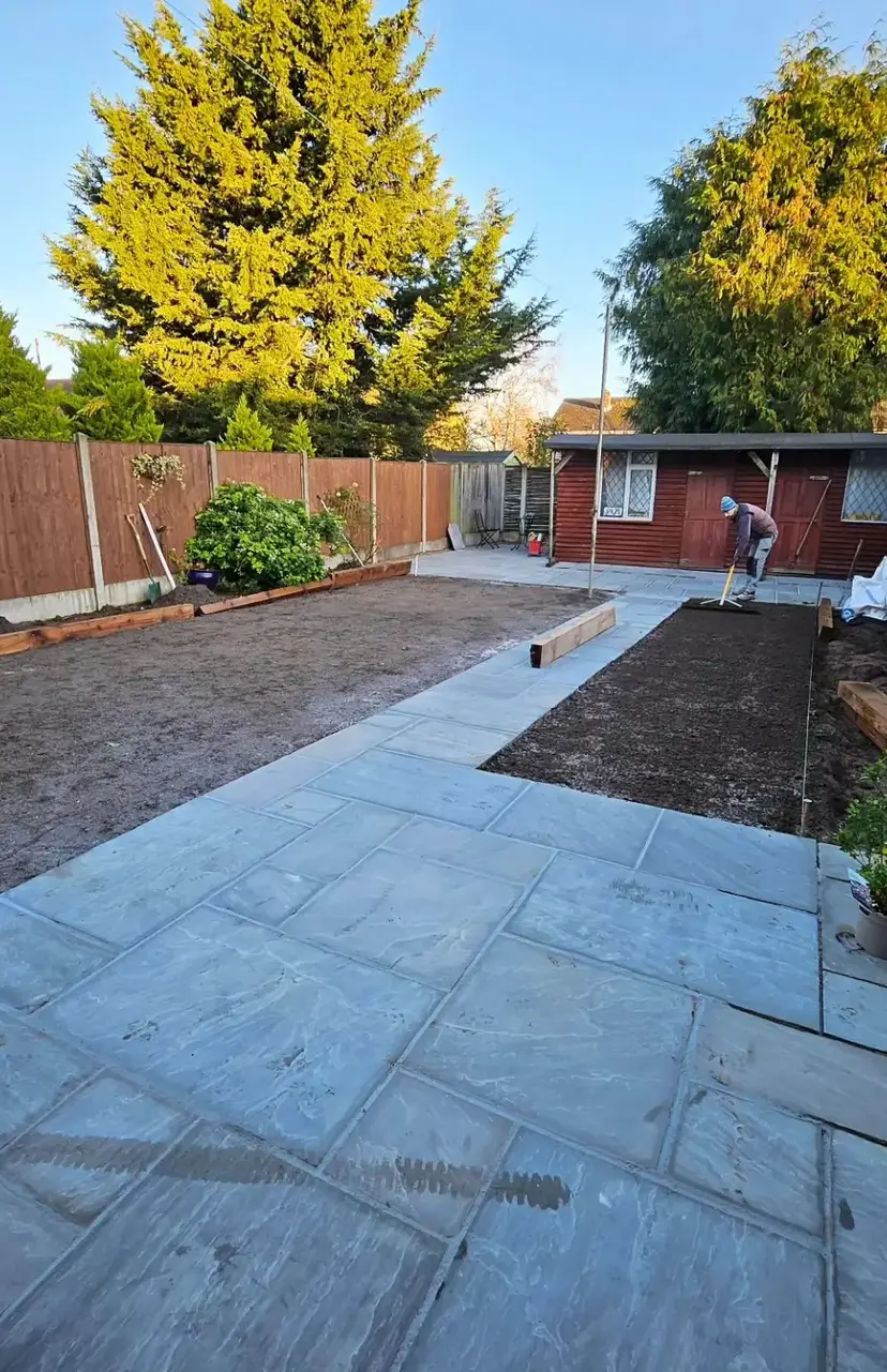 A full garden renovation like this typically takes around two weeks from start to finish, including ground preparation, drainage installation, excavation, laying paving and finishing touches.