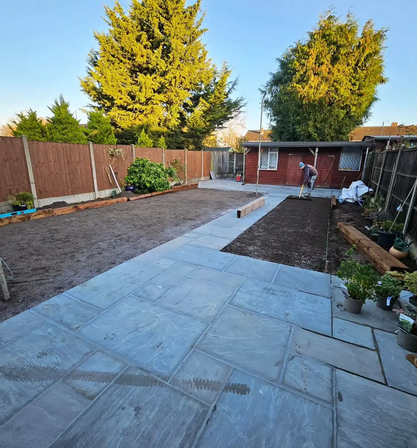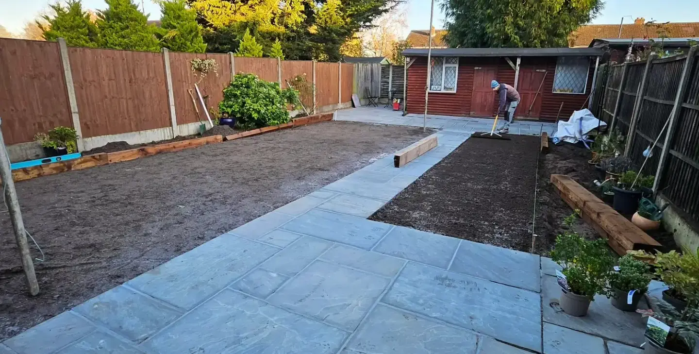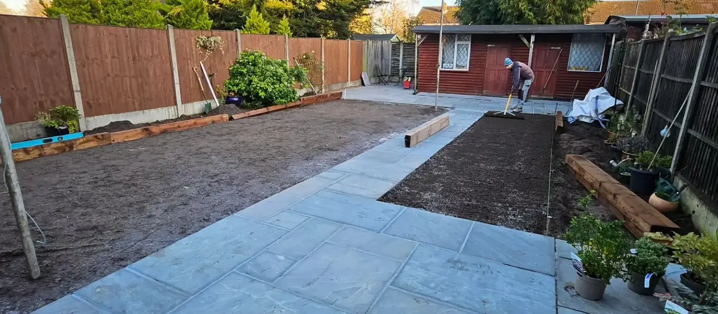 A full garden renovation like this typically takes around two weeks from start to finish, including ground preparation, drainage installation, excavation, laying paving and finishing touches.